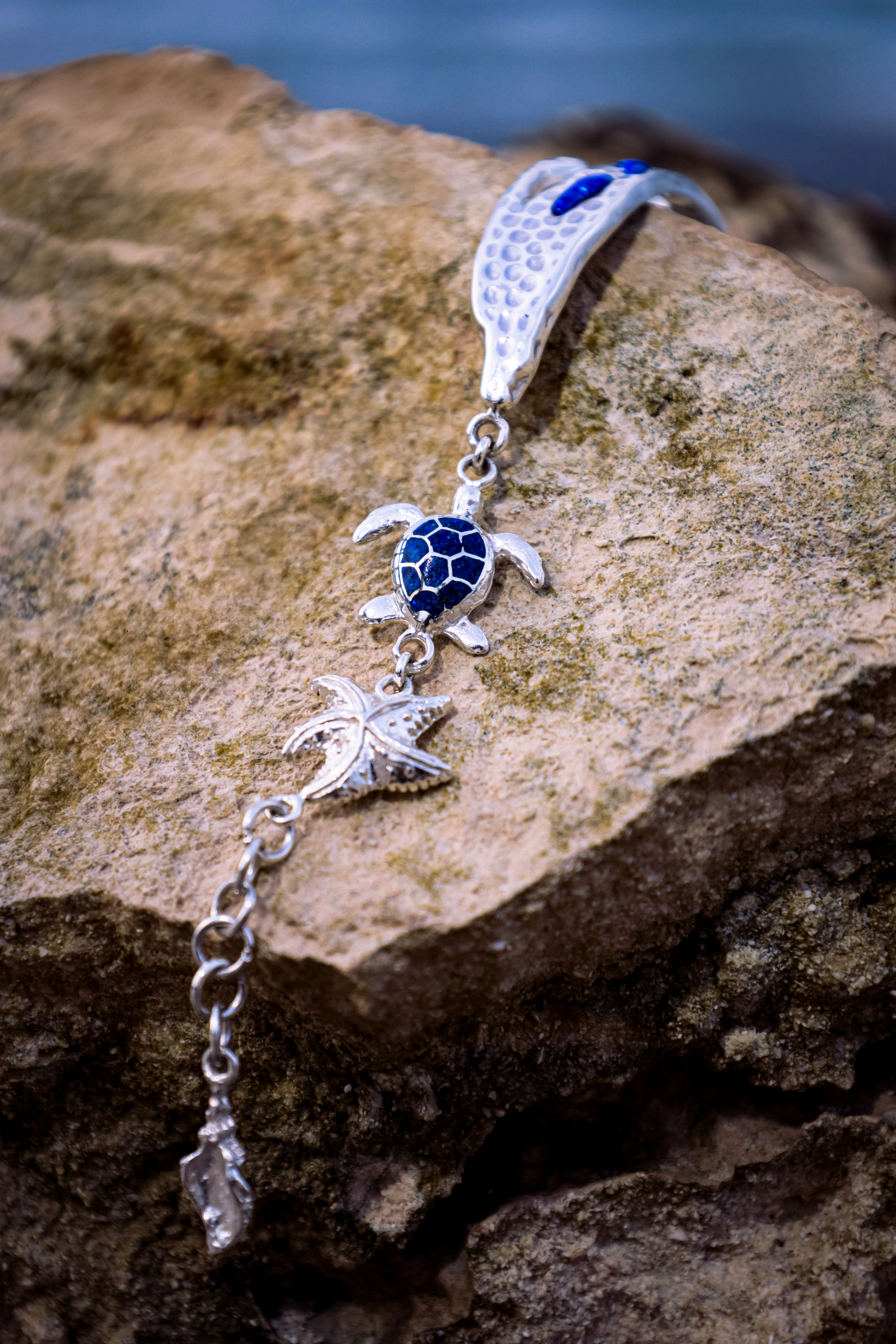 “.925 silver bracelet shaped like Isla Mujeres ,adorned with a turtle, starfish, and snail. This unique design combines the essence of isla with iconic marine symbols. The turtle represents wisdom and longevity, while the starfish symbolizes guidance and protection. The snail, with its spiral shape, evokes harmony and balance. A perfect gift for those who love the sea and isla . Handmade with love and dedication.”